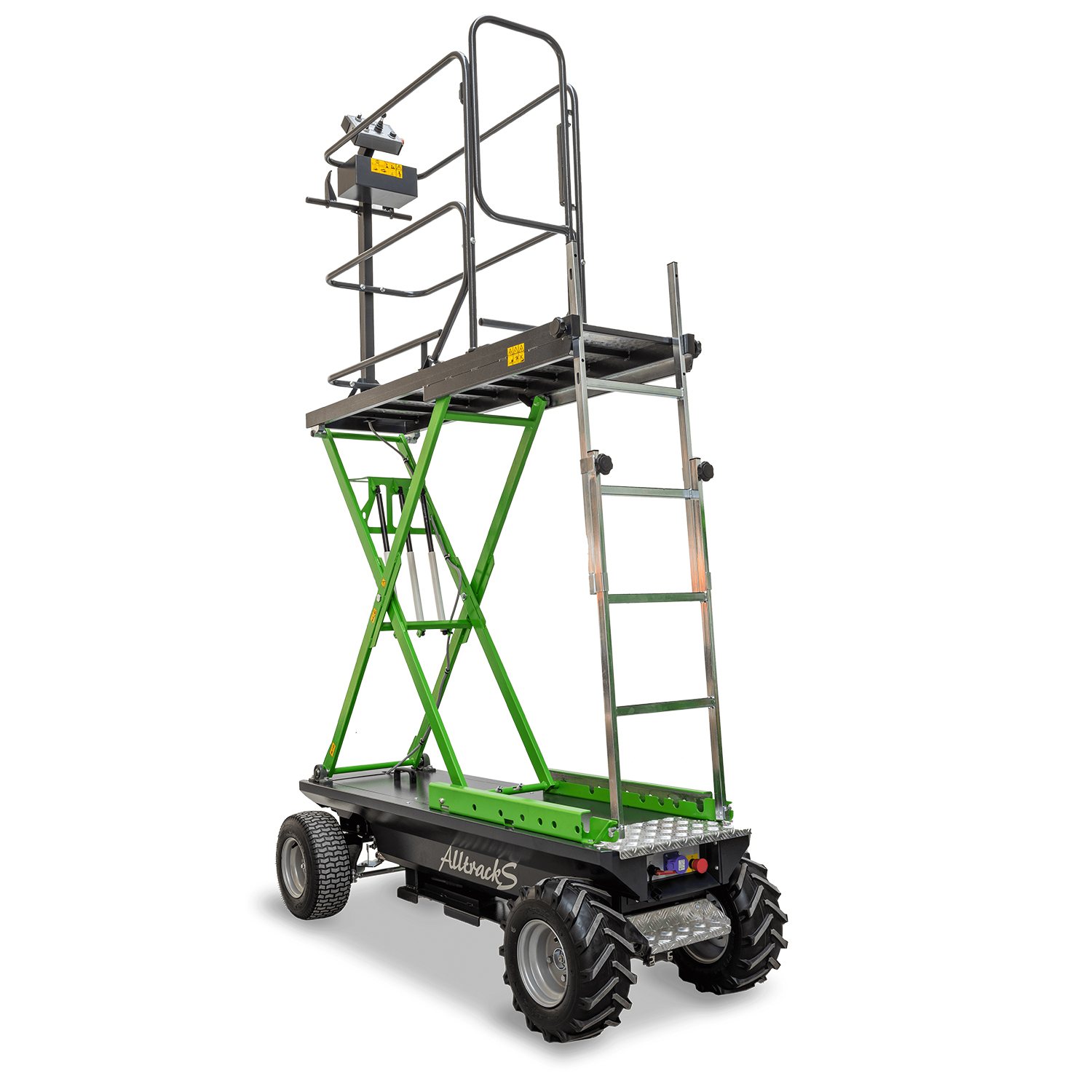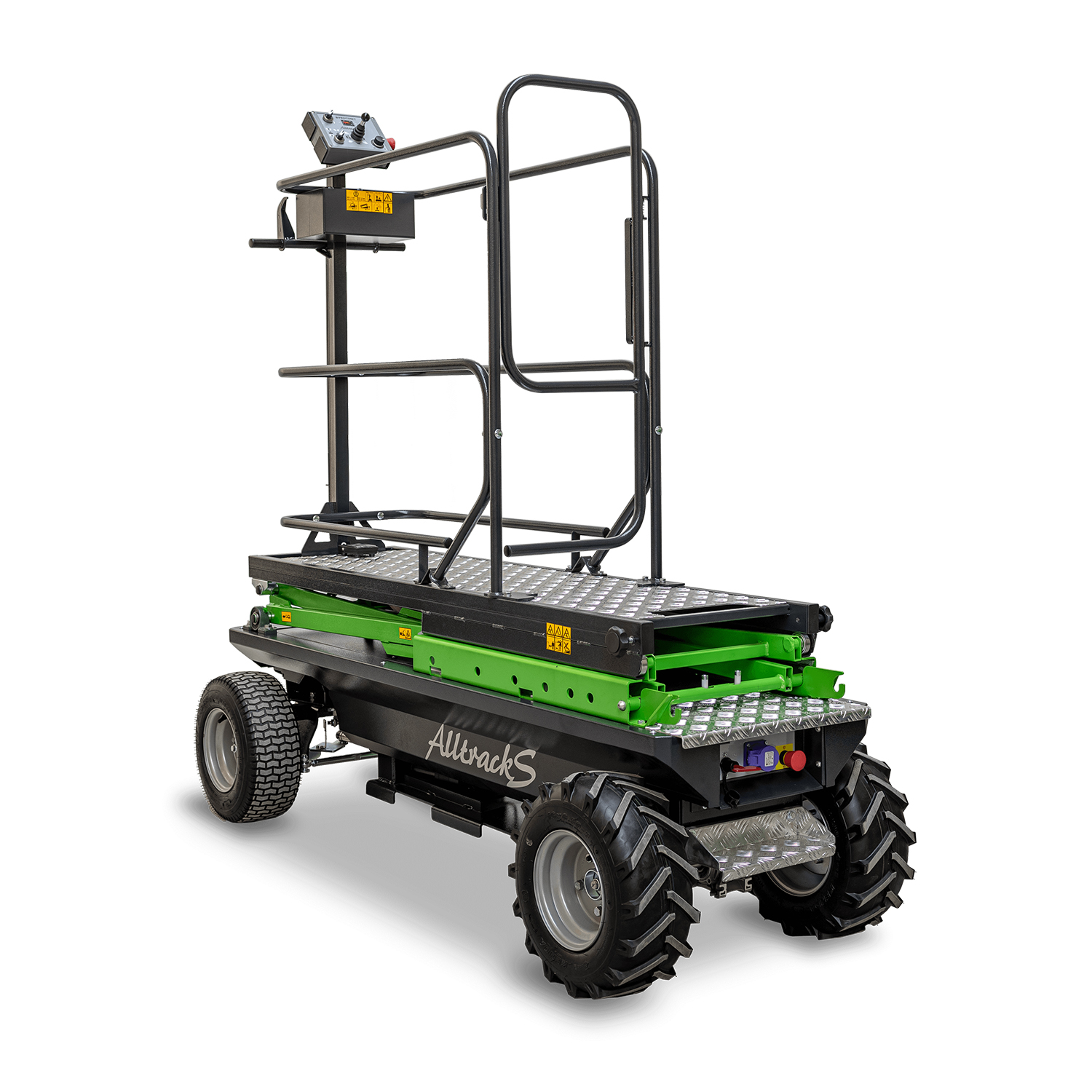 Sterowany elektryczny wózek terenowy do pielęgnacji roślin o szerokości 75cm lub 90cm na gumowych pneumatycznych kołach z ręczną regulacją platformy roboczej przeznaczony jest do pielęgnacji roślin w szklarniach, tunelach foliowych, pieczarkarniach i farmach wertykalnych, gdzie rośliny uprawiane są na nieznacznej wysokości (max wysokość platformy: 190cm, max wysokość robocza ~360cm). Podnośnik ręczny jest obsługiwany przez 3 cylindry pneumatyczne.