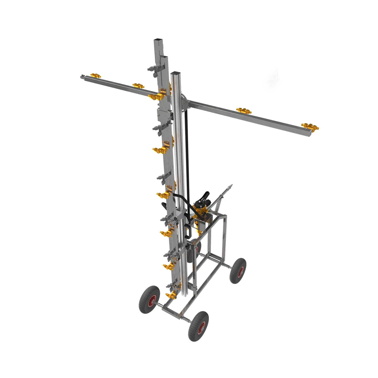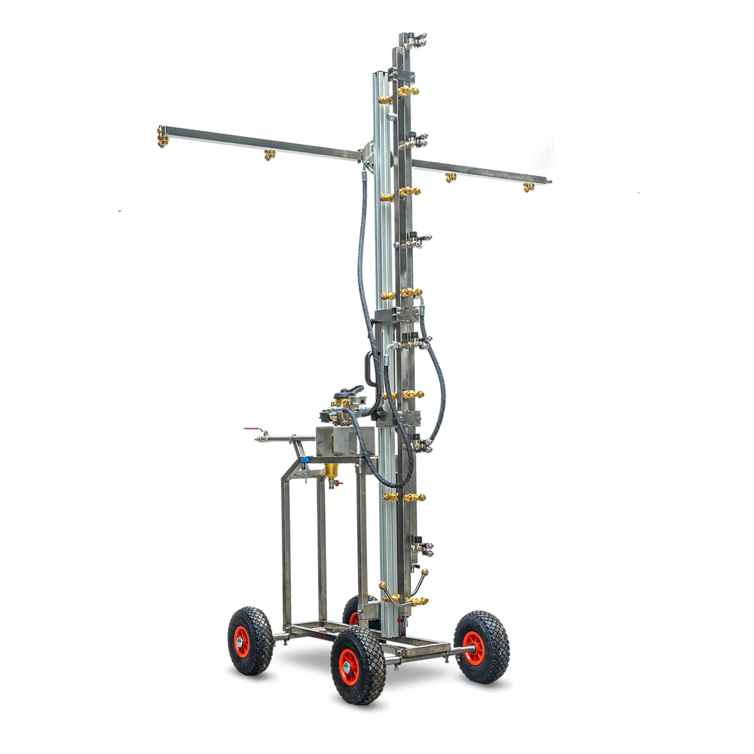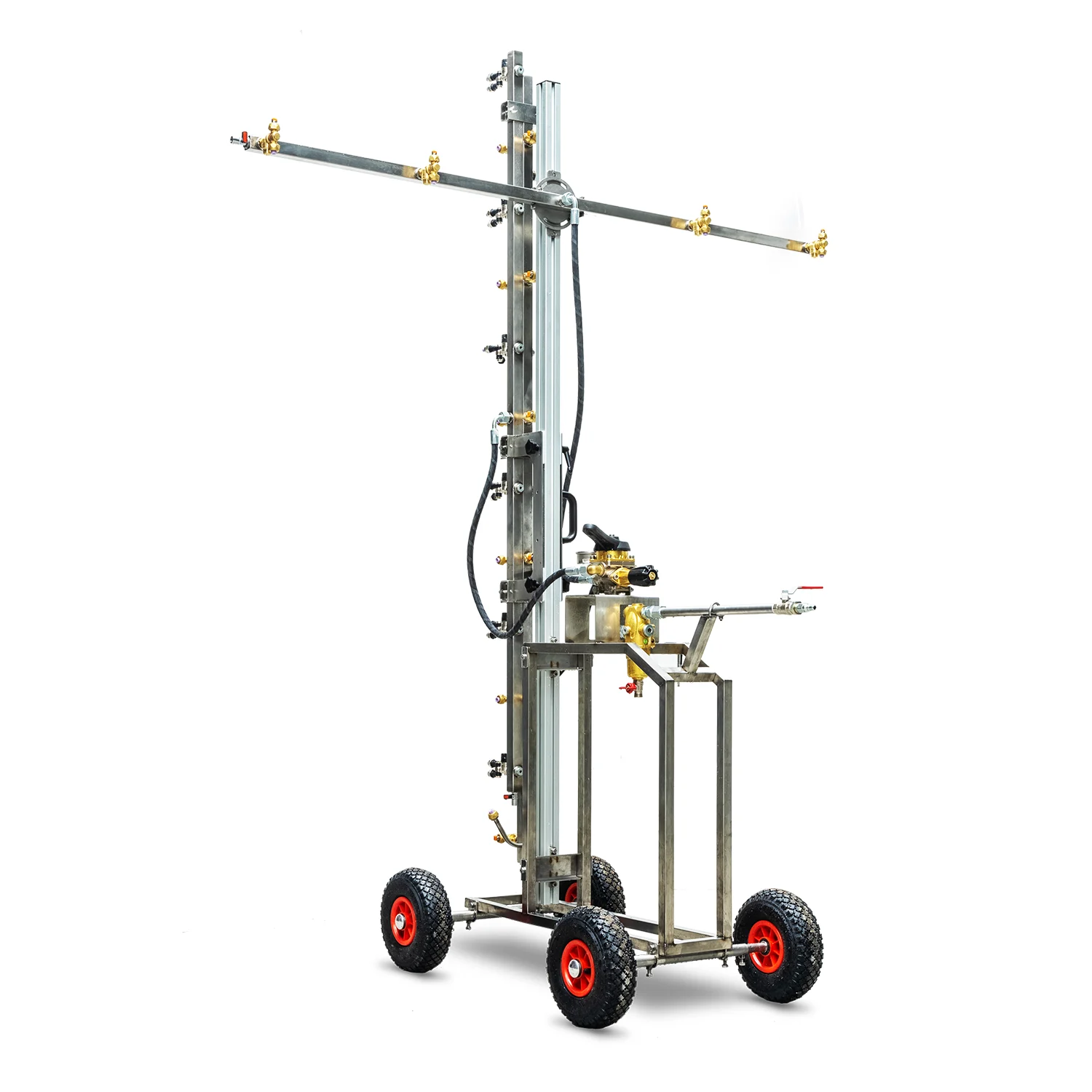 Dysze wykonane zostały z tworzywa odpornego na środki chemiczne, ceramicznymi wkładami zapewniającymi im trwałość. System przenośnych opryskiwaczy może być uzupełniony o kółka z wieńcem do systemów rur grzewczych, kółka gumowe pełne lub kółka pneumatyczne do prawy w otwartych przestrzeniach (uprawy polowe). Rozstaw kółek można bez trudu regulować w celu ich dopasowania do różnych systemów rur grzewczych (dotyczy systemów ruro szynowych)